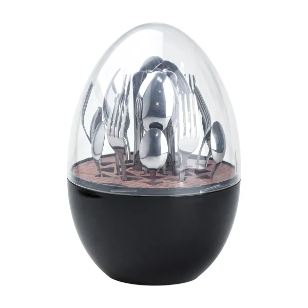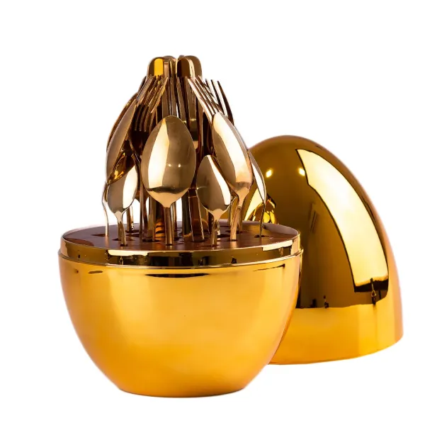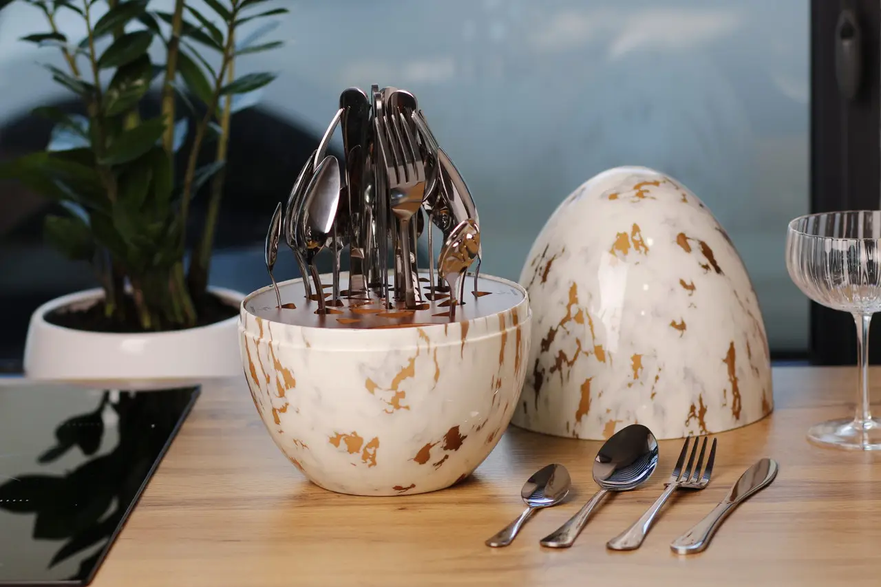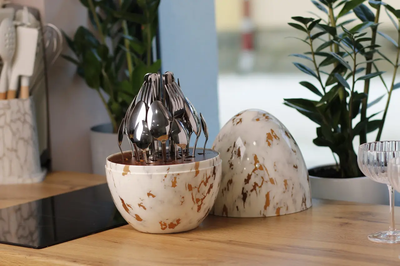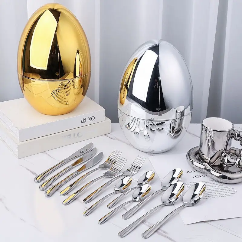 Купила цей набір, бо сподобалася ідея з упаковкою у вигляді яйця 🩵 А всередині — якісні столові прибори, не іграшкові! Метал щільний, виглядає гарно. Дуже зручно, коли все в одному місці, не треба шукати по шухлядах.