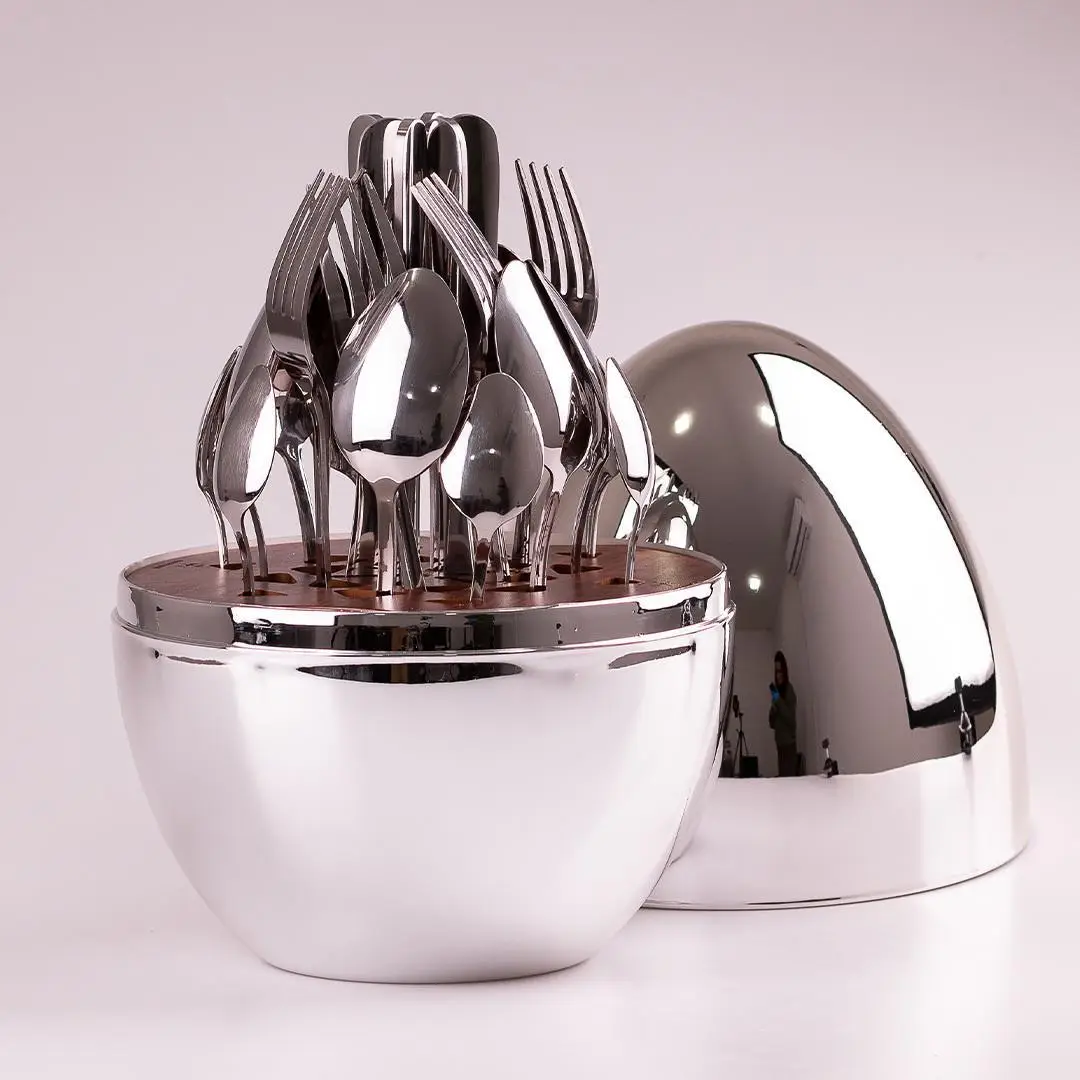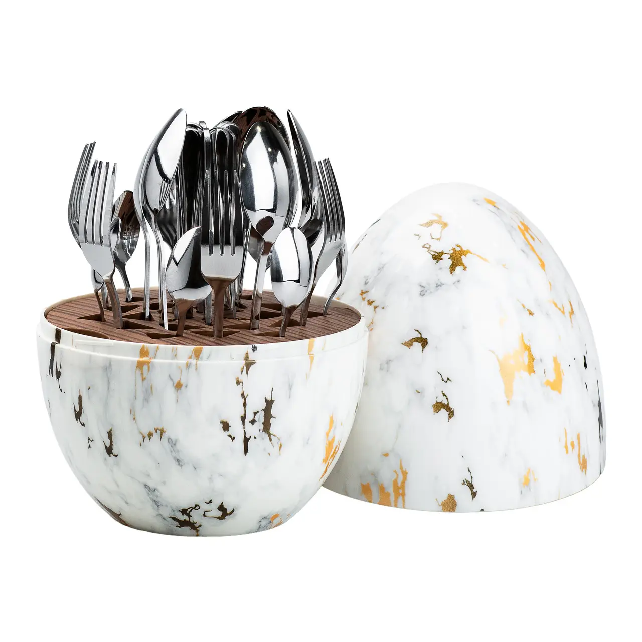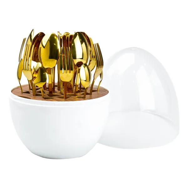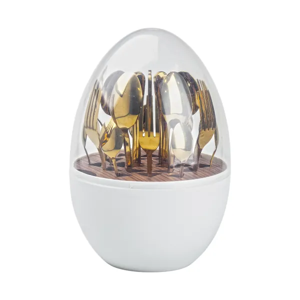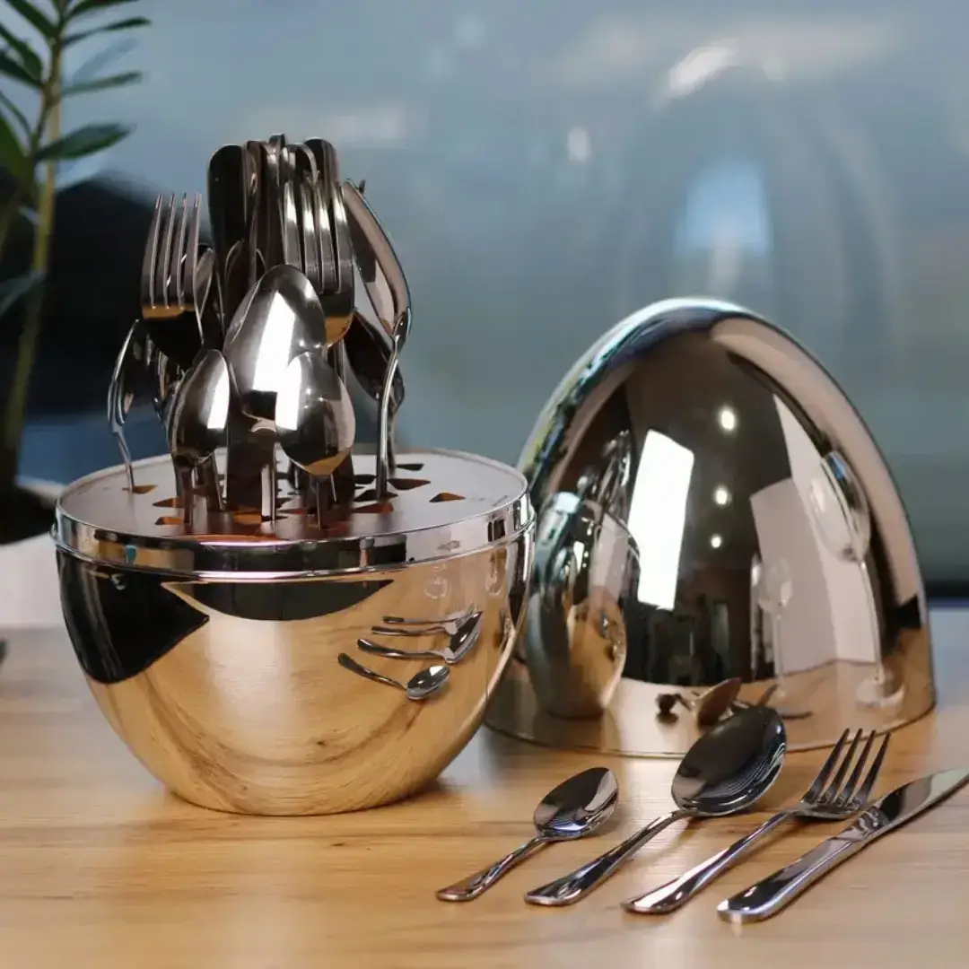 Купила цей набір, бо сподобалася ідея з упаковкою у вигляді яйця 🩵 А всередині — якісні столові прибори, не іграшкові! Метал щільний, виглядає гарно. Дуже зручно, коли все в одному місці, не треба шукати по шухлядах.